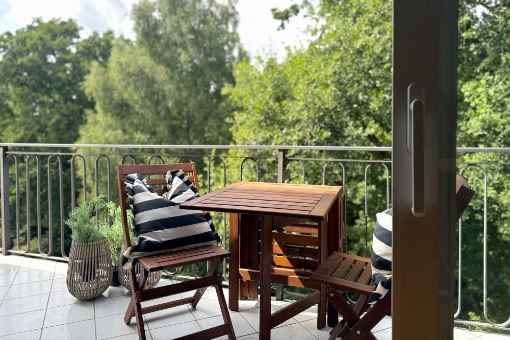 Sonniger Balkon: gefliest und mit herrlichem Blick ins Grüne sowie auf den Alsterlauf