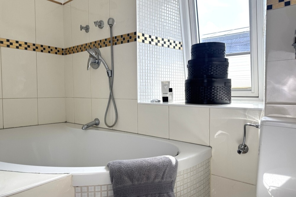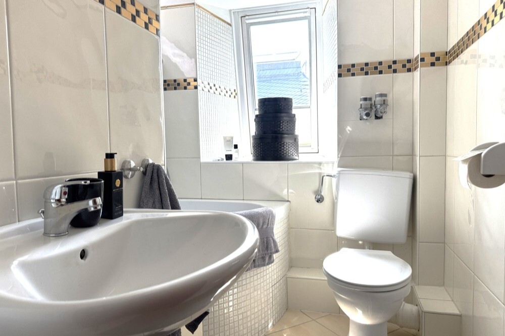 Das Badezimmer ist mit Badewanne, Waschbecken und WC ausgestattet und bietet eine solide Grundlage für eine moderne Gestaltung. Fliesen in Küche, Bad und Balkon unterstreichen die robuste Bauweise und lassen viel Raum für individuelle Ideen.