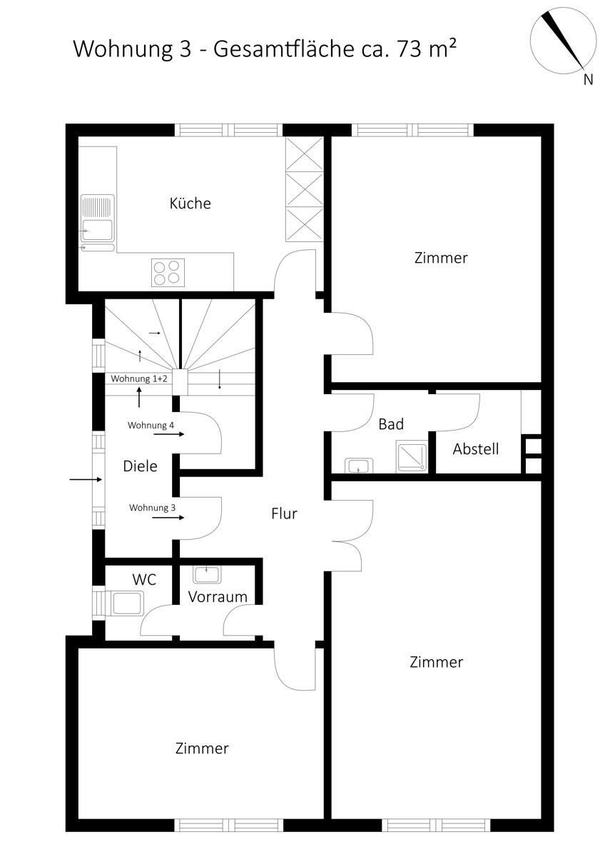 - Wohnung 3: 73 m², 3 Zimmer, Duschbad