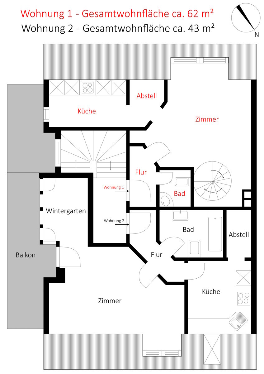 - Wohnung 1: 62 m², 3 Zimmer, Vollbad, Balkon