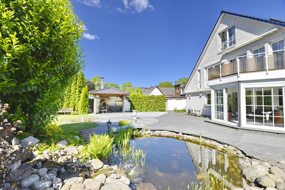 Die Doppelhaushälfte ist mit 265 m² und sieben Zimmern großzügig und repräsentativ. Dieser ist mit 940 m² der größte Teil des Grundstückes zugeordnet, auf welchem sich ein schön angelegten Garten befindet.