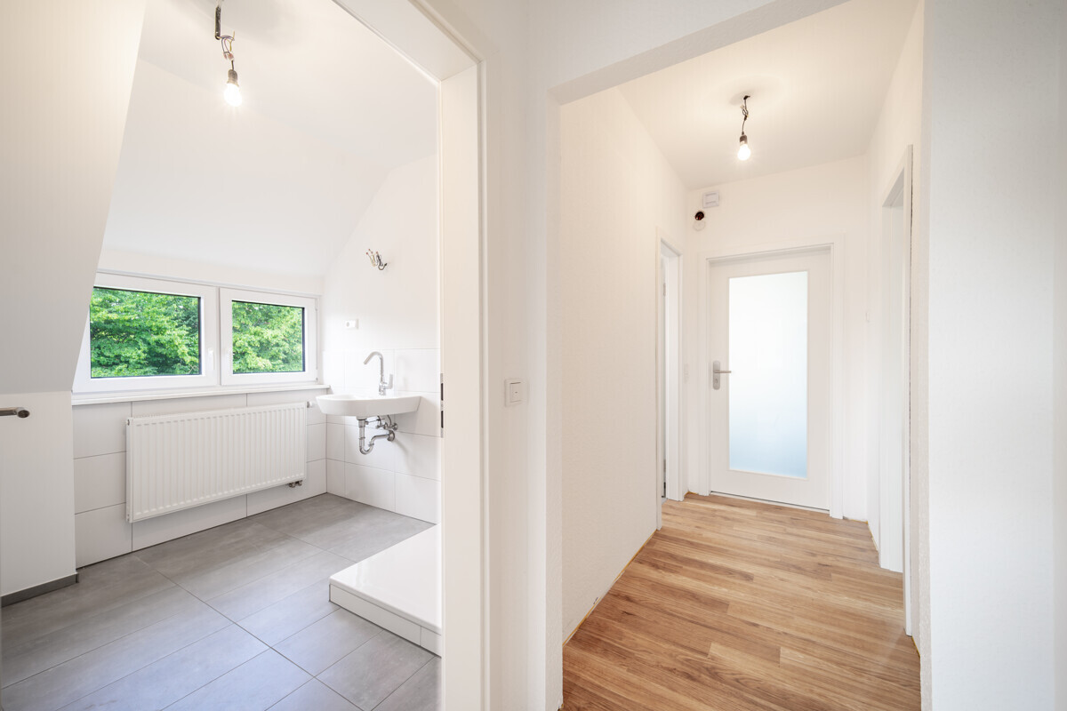 Das Obergeschoss bietet frisch sanierte, unbenutzte Bäder: ein modernes Duschbad und ein separates Gäste-WC. Die Räume sind renoviert, mit pflegeleichtem Vinylboden, weißen Türen und neutralen Wänden.