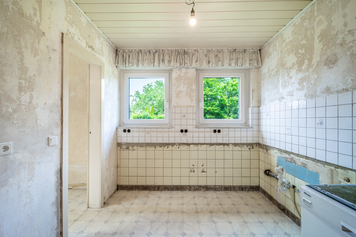 Im Erdgeschoss wartet das Haus auf die individuelle Fertigstellung durch die neuen Eigentümer: Oberböden, Wandbeläge (die aufgrund der erneuerten Elektrik entfernt wurden), Fliesenspiegel in der Küche sowie Türen können hier noch nach eigenen Vorstellungen gestaltet werden. Ein Gäste-WC mit Badewanne ist bereits vorhanden.
