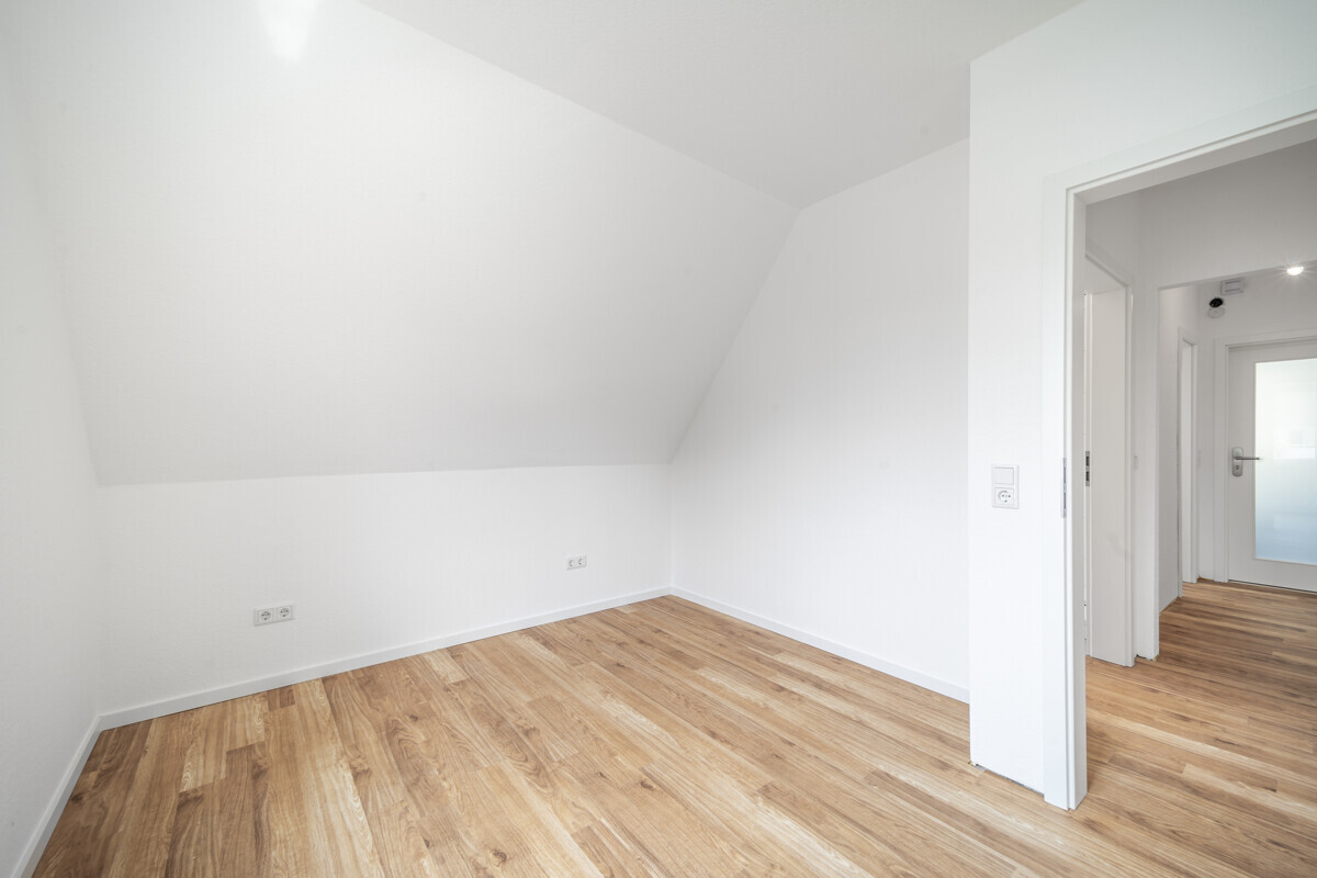 Das Obergeschoss bietet frisch sanierte, unbenutzte Bäder: ein modernes Duschbad und ein separates Gäste-WC. Die Räume sind renoviert, mit pflegeleichtem Vinylboden, weißen Türen und neutralen Wänden.
