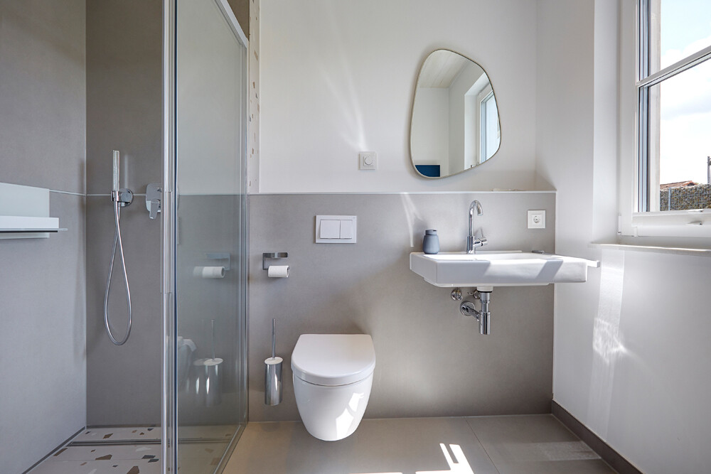 Rechts vom Eingangsbereich befindet sich das im klaren Stil designte Gäste-WC mit Regendusche.