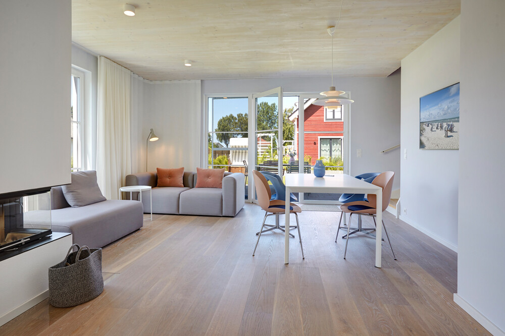 Infolge der hellen Farben an Wand und Holzdecke im Erdgeschoss und die bodentiefen Fenster entsteht das Gefühl einer lichten und transparenten Atmosphäre.