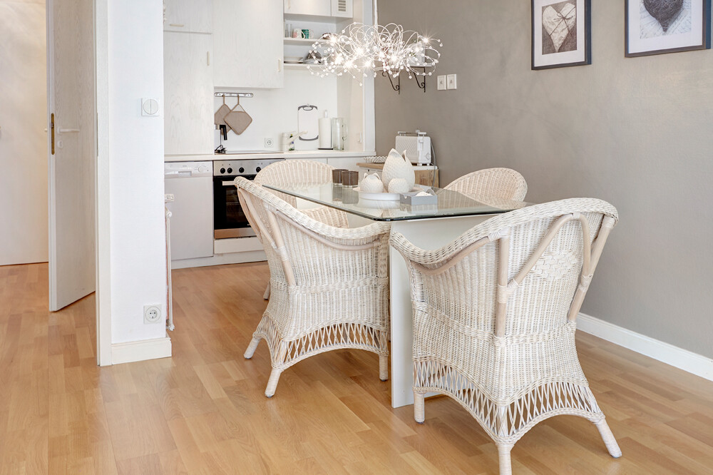Das Herzstück der Wohnung bildet der weitläufige Ess- und Küchenbereich, der nahtlos in den Wohnbereich übergeht.