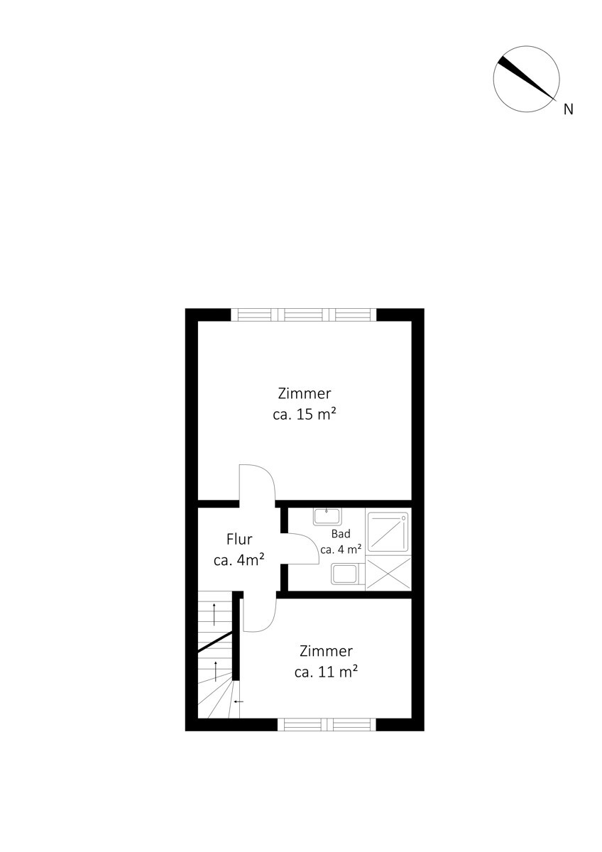 Im Obergeschoss befinden sich ein gemütliches Schlafzimmer, ein helles Durchgangszimmer, das sich flexibel als Büro oder Kinderzimmer eignet, sowie ein modernes Badezimmer.